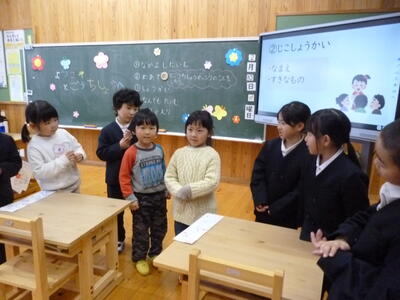 自己紹介後、学校生活クイズや教室たんけんをしました。